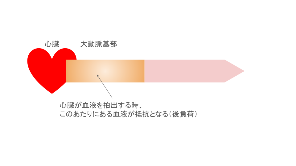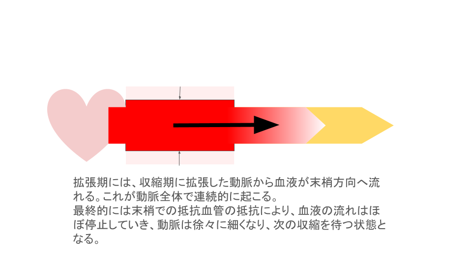 拡張期長ければ長いほど、血管内から血液は末梢へ流れていき、動脈内の血液は減少し、動脈は細くなる。血管の細径化は、血管径の減少と壁厚の増大を意味し、血管の弾性は低下し、後負荷を上げる要素になるが、血液が前方に進むという観点で見れば、血管内の血液量の減少が心臓にとって後負荷が減少させる面もある。