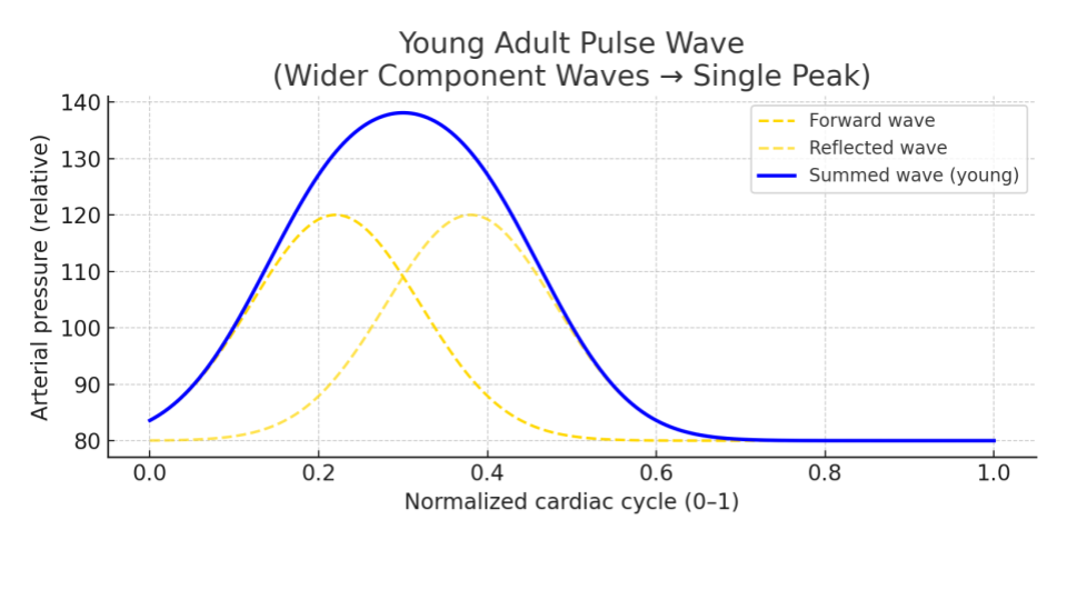若年者では、高血圧でも、まだ、血管の柔軟性が残っていれば、いったん血液が大動脈に十分プールされ、抹消の血液の抵抗を受けるのが遅れ、この2つの最大値がタイミングが離れ、最高血圧は比較的低くなります。イメージとしては、2つの波の一部が重なっていて、高めの血圧がだらだらと続くが、最高値としてはさして高くないというイメージです。