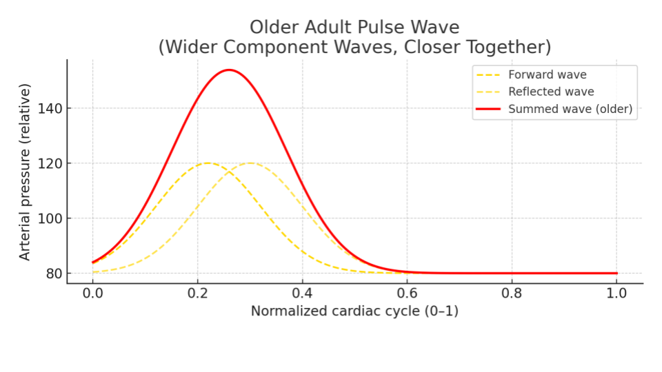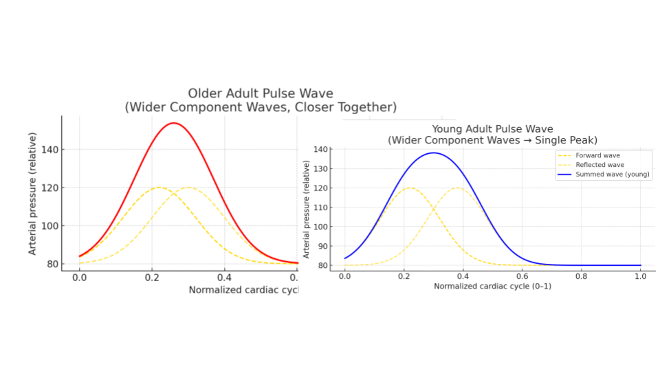 高齢者では、血管が硬くなっているため、血液が血管を拡張させようとしても、押し返される力も強く、また、伸展性が少ないために、収縮期に大動脈に血液がプールされる血液も少なく、多くの血液が一気に末梢と向い、末梢での血液の停滞も早く起きます。すなわち、2つの最大値のタイミングがより重なり合うため、より一層最大血圧が上昇します。イメージとしては、二つの波が重なって、急峻な一つの波になるイメージです。