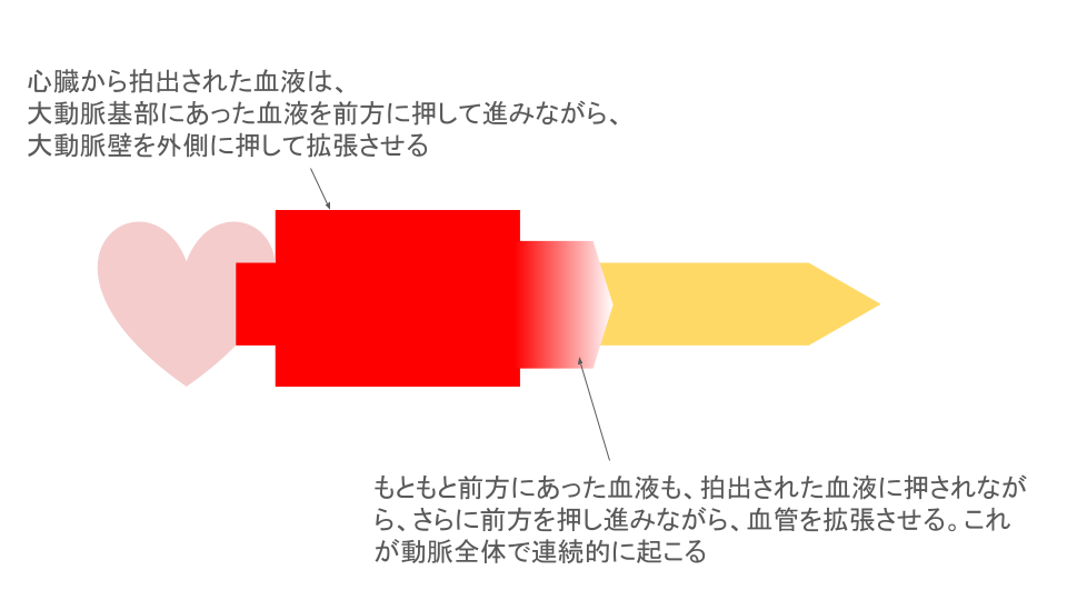 心臓が収縮して血液を大動脈基部に送り出すと、基部に流れ込んだ血液は前方にもともとある血液を押しながら前方に進むとともに、血管壁を押し広げ、血管を拡張もさせます。