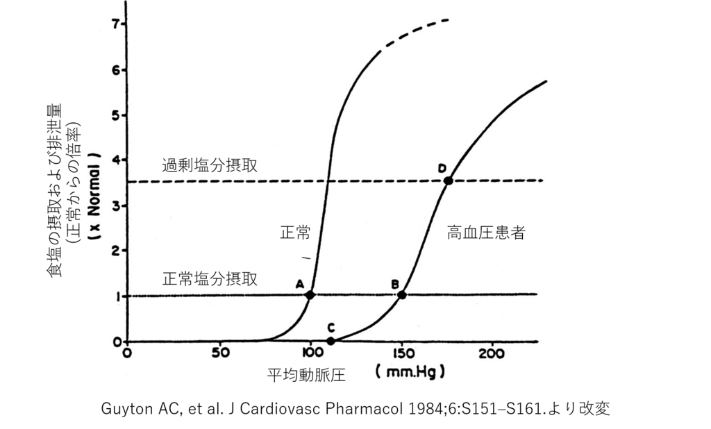 高血圧の状態では、塩分の摂取に対応して、血圧がコントロールされていることがGuytonにより示されています。