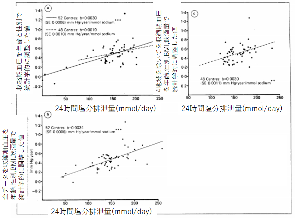 INTER SALT研究(下図1)で、統計学的に年齢と性別(a)、また、年齢・性別・BMI・アルコール摂取量(b)で調整したときに、塩分摂取量と収縮期血圧には有意な相関を認めており、さらに、極端に塩分摂取が少ない4民族を除いても(c)、塩分摂取量と収縮期血圧には有意な相関を認めています。