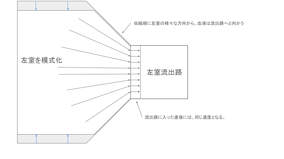 壁と流体の間、流体と流体の間には、摩擦が生じるため、中央が早くて、壁面に近いほど速度が低下する層流となりますが、左室流出路に入った直後では、流出路を形成する心筋内膜と血流との摩擦は無視できると仮定しています。